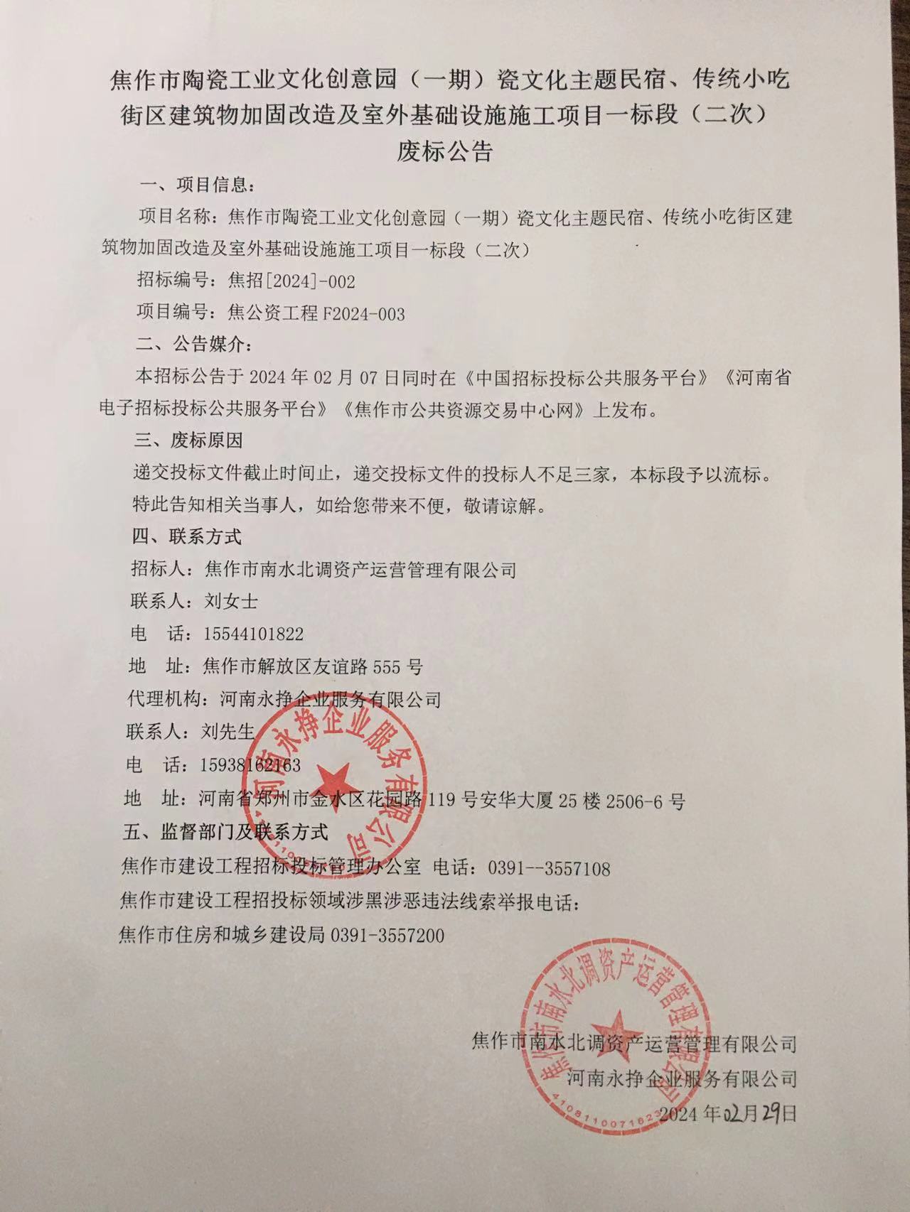 焦作市陶瓷工业文化创意园(一期)瓷文化主题民宿、传统小吃街区建筑物加固改造及室外基础设施施工项目一标段(二次)废标公告 公示信息
